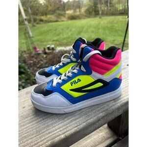 The product is a pair of Fila Girl high top sneakers in size 3, featuring a neon color block design in black. These athletic shoes are designed for girls and have a block heel style. The sneakers also have strap features, making them both stylish and functional for everyday wear. The colorful neon theme adds a fun and vibrant touch to the overall design, making them a trendy choice for young girls looking to add pop to their outfits. Check pictures for any flaws. No box