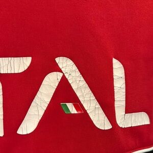 Stylish Fila Sport Italia logo track jacket in red and black. Features a zip-up front and logo detail. Overall very good condition, but there’s a small stain on the left shoulder that is not very noticeable, and the back logo on close inspection has cracks of the lettering from washing and usage. Price reflects.