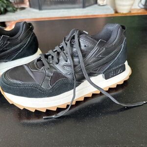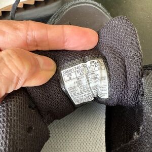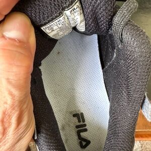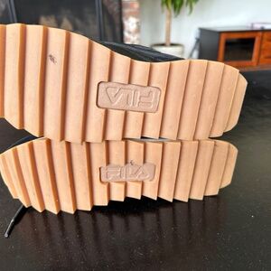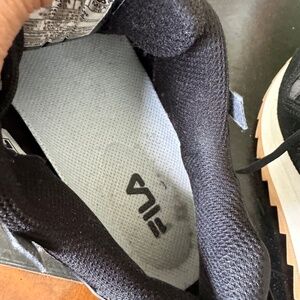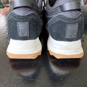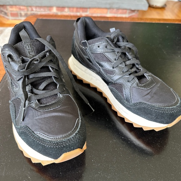 Barely worn Fila black leather sneakers. Size 9. Chunky white and tan sole. Sturdy construction. Selling for my friend who loves sneakers and has so many! Ready to go!