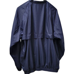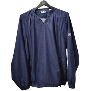 This Fila men's wind shirt in size 2XL features a V-neck, long sleeves, and a pullover style. It is made of polyester in a solid blue color, with a lined and collarless design for breathability. The athletic fit is suitable for activewear, with performance features ideal for walking and golf in winter, fall, and spring seasons.
