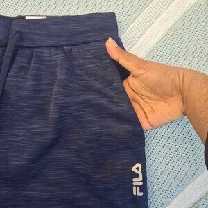 Navy athletic pants with Fila branding. Comfortable fit. Ideal for workouts or casual wear.