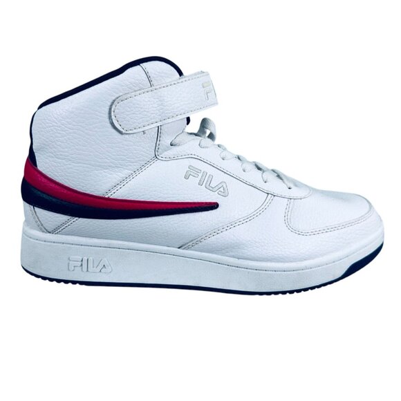 Fila Mens High-Top Sneakers White/Red/Blue Leather Lace-Up & Hook-And-Loop Strap