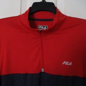 Fila Mens L/S Red Navy Stretch 1/4 Zip Active Golf Runner Windshirt. Size Large. Armpit-to-armpit 23", Length 29". 88/12% Polyester/Spandex in Red/Navy. Previously owned but lightly used, zero sign of wear or defect.
