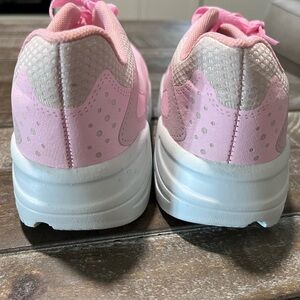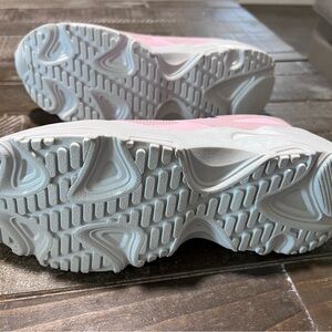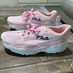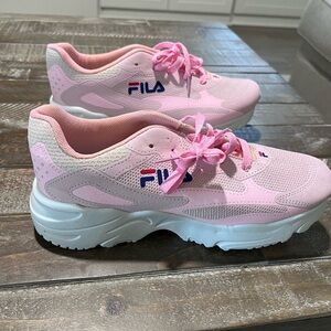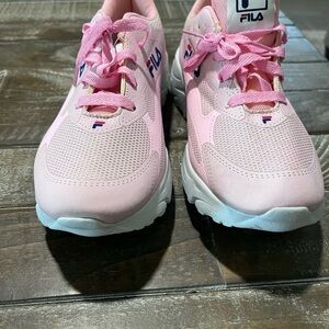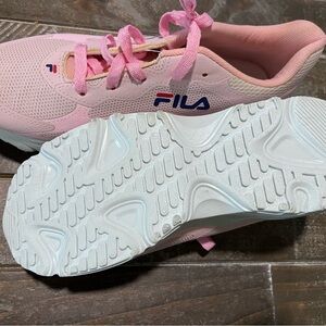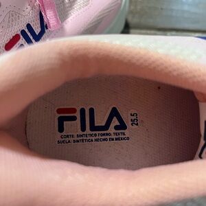Stylish pink sneakers with Fila branding. Perfect for casual wear. Size 25.5, which is 9 U.S.