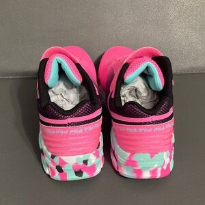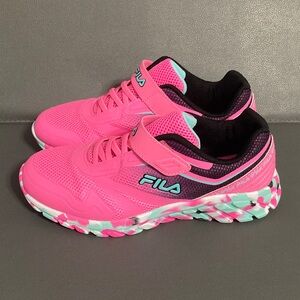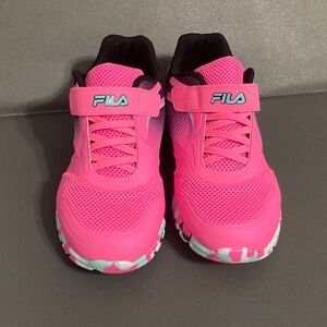 Bright pink Fila shoes with black accents. Features a multicolored sole and adjustable strap.