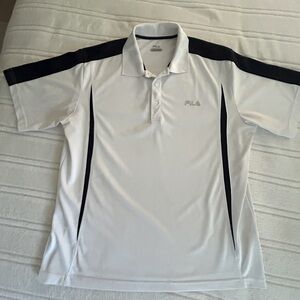 Classic Fila polo with dark blue shoulder accents. Size Slim XXL with navy slimming stripes on each side of shirt. Gently worn once great condition! Perfect for casual outings. Made of Polyester. Please see photos for dimensions. Wear for work too, nice shirt!