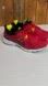 Red sneakers with black and white details. Neon yellow highlights.
