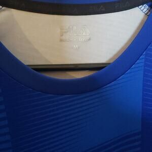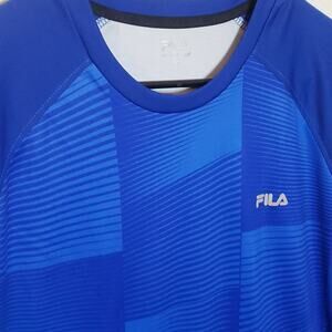 This Fila T-shirt is a great addition to your activewear collection. With its geometric pattern and blue color, it's perfect for a classic look during summer activities. The shirt is made of a combination of polyester and spandex, making it breathable and easy to care for with machine washing. The shirt also features a crew neck and short sleeves for added comfort, and includes a FILA logo as an accent. It's available in size medium, with a regular fit for men.