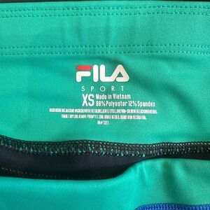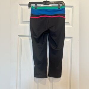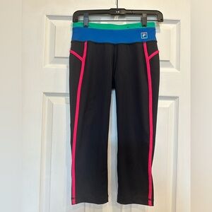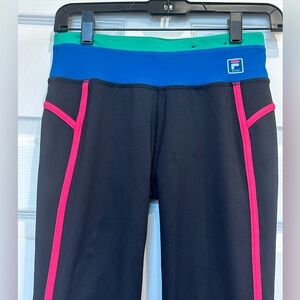 Fila Sport leggings, capri leggings XS, black workout leggings, colorblock waistband leggings, pink trim fitness pants, cropped athletic leggings, yoga pants small waist, XS gym leggings, moisture wicking activewear, sporty capri tights, Fila black leggings XS, training running leggings, low rise compression leggings, bold trim performance leggings, stylish gym pants XS