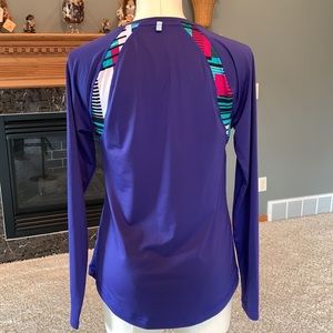 This is a like new Fila Sport top in a size medium. Color is purple with multi stripe. Please see the pictures. Fabric is 88% polyester and 12% spandex.
