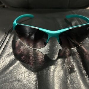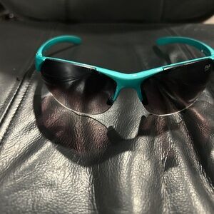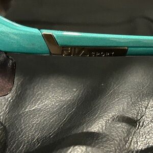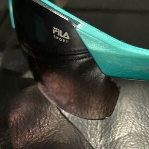 Chic Fila sunglasses with teal frames. Dark lenses for sun protection.