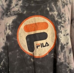 Stylish Fila tie-dye t-shirt with a bold logo. Features a mix of black and gray colors.