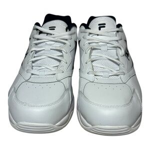 Crisp white Fila shoes with dark blue details. Ideal for everyday comfort. Like New Condition