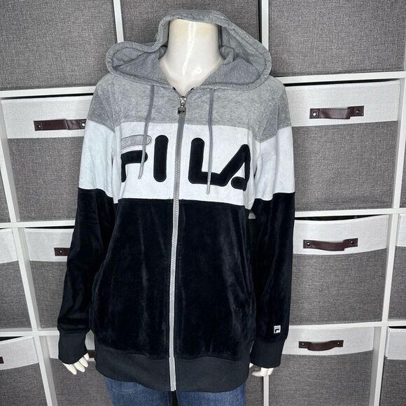 Fila Velour Track Hooded Jacket Size Large. Please see all pics for condition. One small pin hole on shoulder.
