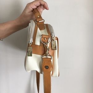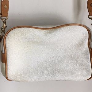Very stylish white pebble leather with tan trim. Detachable shoulder strap. Has some slight discoloration on the back side of the handbag. Inside lining is clean with one zippered pocket and one flap pocket. Exterior snap pocket. Two top zippers. Dimensions are 9 inches wide x 6.5 inches tall x 3.5 inches deep.
