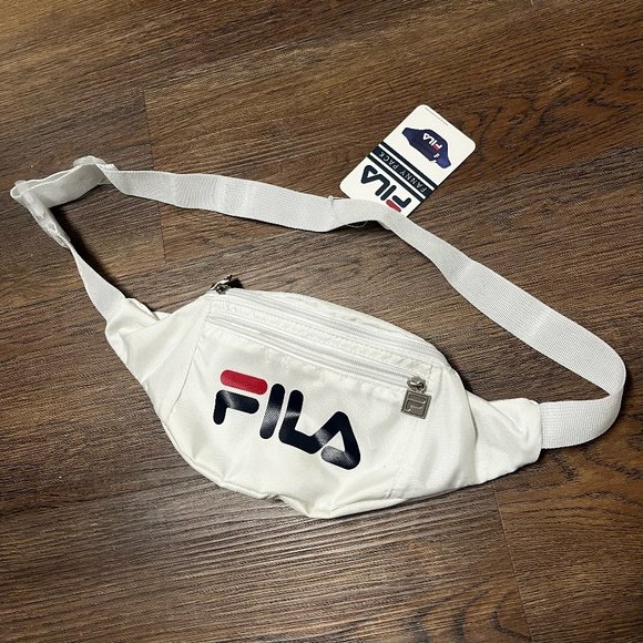 New with tags, Fila vintage "90's style" fanny pack. Awesome accessory from an old school athletic and streetwear brand. Perfect condition white bag with clear clasp, metal Fila logo zippers, and multiple pouches for storage. From a 90's costume party to every day street style, this thing is pretty much ready for what ever bag needs you have. Can be a crossbody bag, waist pack, hip pack, or belt bag.