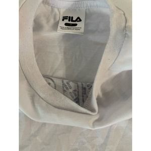 Pre-Owned Fila White Dark Blue Sleeveless Logo Kids Shirt. Size 7. 100% Polyester. Great pre-loved condition. This sleeveless shirt showcases a classic white base with dark blue accents and the iconic Fila logo, offering a sporty and stylish look. The pre-loved charm adds character, making it a comfortable and trendy choice for active days or casual outings, effortlessly blending athletic flair with casual coolness.