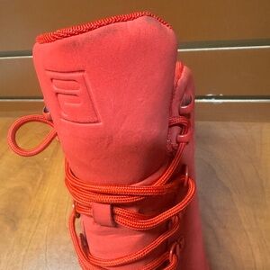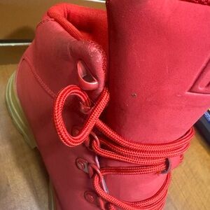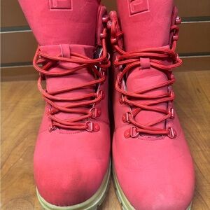 Stylish and sturdy combat boots. Vibrant red color. Ideal for urban adventures.