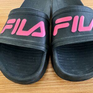 Fila Women's Slides Flip Flop slip-on Black Pink Lettering Size 10