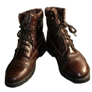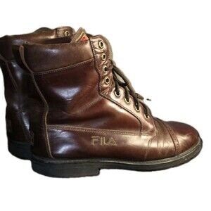 The product is a pair of Fila Y2K circa 1990s to 2000s men's ankle boots appreciate 8" tall in size 10 1/2D, featuring a solid brown color with a lace-up closure. Made of leather, these boots have a cap toe design and a rubber and leather outsole. The boots are vintage and are from the brand Fila. They are designed for men and manufactured in Brazil. These stylish and durable ankle boots are perfect for adding a touch of sophistication to any outfit. Condition is great. Worn, But well taken cared of.