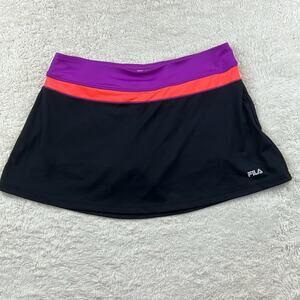 Black, hot pink, and purple skort with ample stretch and back zip pocket.