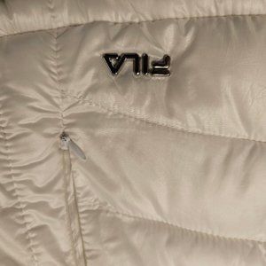 Fila puffy jacket, Women's Large, polyester, white with purple inner hood