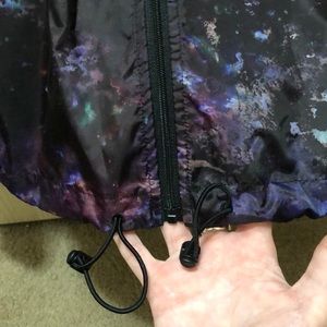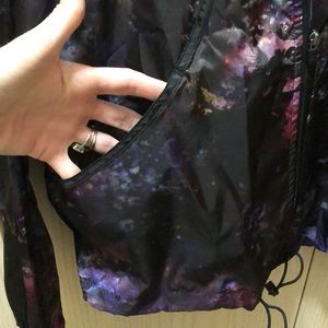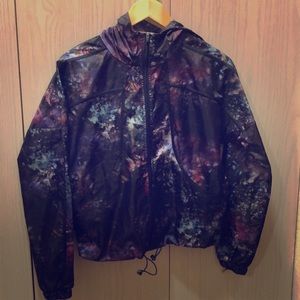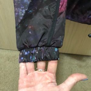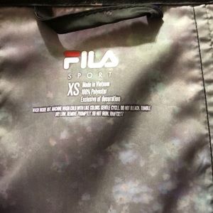 Beautifully colored Fila zip up lightweight jacket. Outer pockets as well as inside pockets. Hooded with conch straps to keep it close to your head if rainy or windy. Sport jacket. XS 100% Polyester. Purples, blues, black brown, burnt orange colors all mixed in like a tie die.