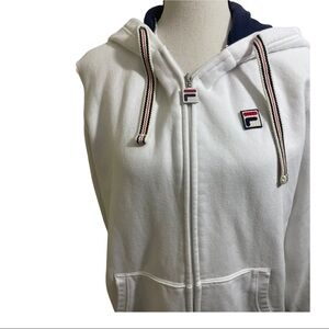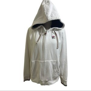 Fila zipper front hoodie light fleece inside. White with blue red white accents. Size Medium.