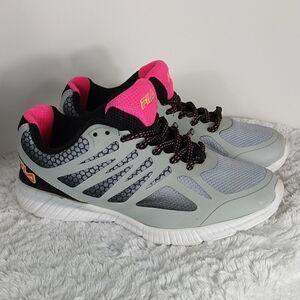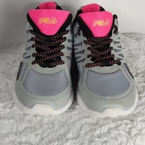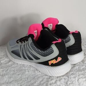 These Fila gray with pink trim lace-up running sneakers are a size 6-1/2. They have cushioned insoles for comfort. Pre-owned and in excellent condition. All offers welcome.