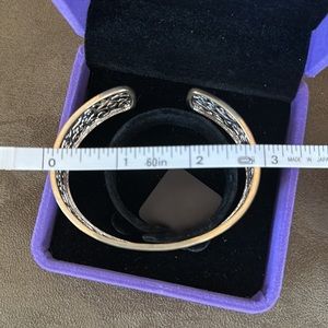 New in box. Can squeeze to adjust to wrist. Small edge tarnishing, not sure if Sterling. No stamp.