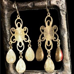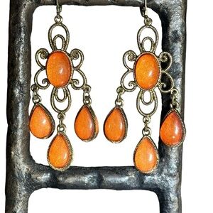 Bohemian orange earrings in filagree brass tone setting. Chandelier design with free form movement. Fun, Playful, Hippyish