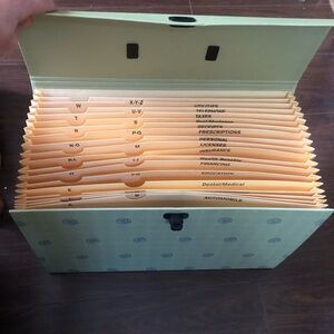 Portable Expanding File Box, 19 Pockets, A-Z Tabs, Latch Closure with handle to carry. Stay organized in your office or on the road with this 19 pocket expanding file box. The Expanding File Box holds more than 1400 sheets of both letter and legal size paper. Comes with printed tabs/labels (A-Z and Subject), as well as a comfortable handle and a twist-style closure. Good condition. Hardly used!