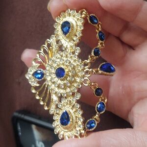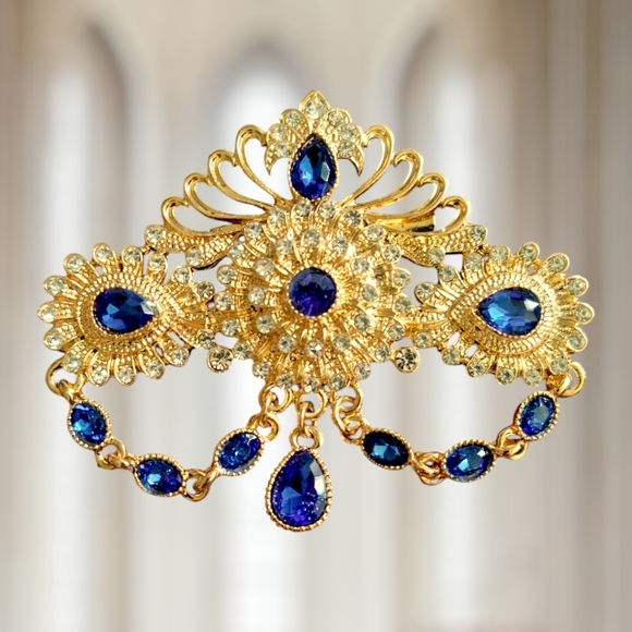 This exquisite brooch features a stunning combination of golden filigree and blue rhinestones, perfect for adding a Morrocan touch