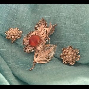 Vintage Silver filigree brooch with center gem, clip on earrings with the set.