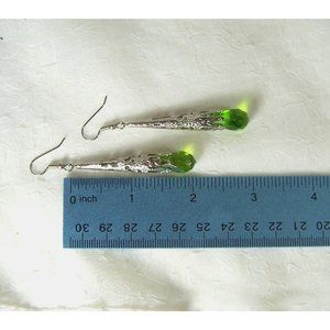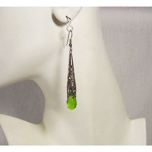 Filigree Cone Green Glass Drop Earrings Silver Tone Vintage Style