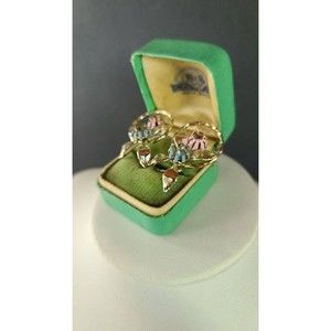 All stones are intact. In good vintage condition. A few light surface scratches. Some discoloration and flaking of the metal. Please see photos. Sold as is. Priced accordingly.