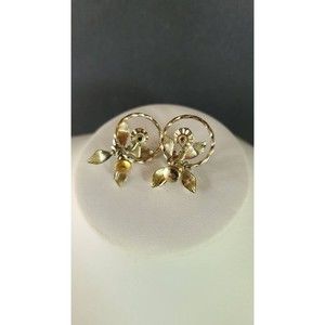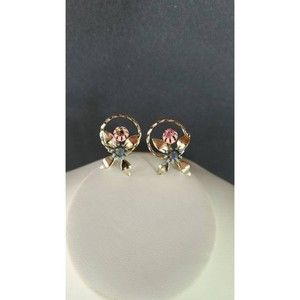 These are a pair of vintage screwback filigree earrings each with a pink and blue enamel flower and rhinestone inside.