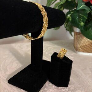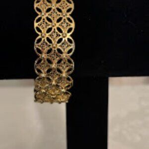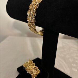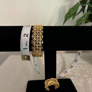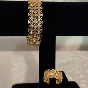 This stunning Filigree jewelry from Portugal features a beautiful adjustable bracelet and ring set in silver. The intricate geometric design adds a touch of elegance to any outfit, while the gold color adds a touch of luxury. The brand is well-known for its high-quality jewelry, and this set is no exception. Crafted with precision and care, this bracelet and ring set is perfect for any fashion-conscious individual. The cuff style and adjustable feature make it easy to wear and comfortable on the wrist. Made from unknown material, this set is a must-have for anyone who loves unique and beautiful jewelry. Add this Filigree jewelry set to your collection today!