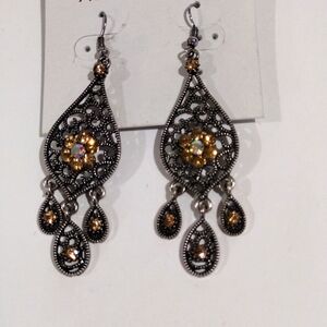 These Filigree & Fringed Design Gold color Crystal Drop Dangle Earrings bring an elegant and bohemian flair to your jewelry collection. The intricate filigree design is paired with shimmering gold color crystals and delicate fringes, creating a lightweight yet statement-making piece. Perfect for special occasions or adding a touch of elegance to casual outfits.