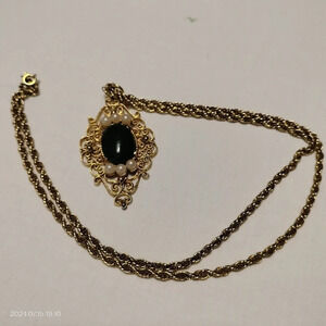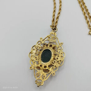 Filigree Pendant With Pearls and Green Gemstone Cabochon Gold Tone rope chain