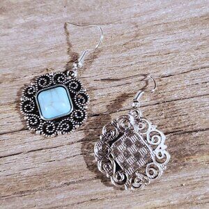 Filigree Rhombus Turquoise Blue Stone Silver Dangle Earrings