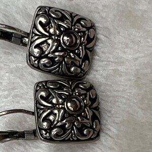 Filigree square drop earrings in silver tone. Scroll design, textured, good condition. Measures approx 1" long.