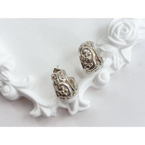 Lovely pair of sterling silver scroll filigree open hoop earrings. The earrings have a gorgeous cutout filigree style (not quite filigree, more like filigree adjacent). The enclosure is post back style with original backings. The backings are also sterling. These are lightweight and comfortable for all day wear. The hoops widen and then taper towards the end. Marked as sterling on the interior of the hoops, a bit faded but it's there. Tested positive for sterling via chemical testing.
