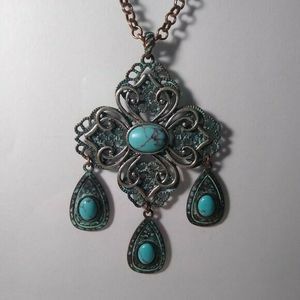 Antiqued copper tone and silver tone metal filigree pendant