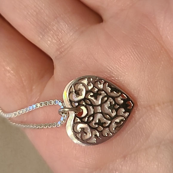 Filigree heart over mother of pearl heart sterling silver necklace