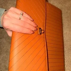 A leather feel. It is beautiful and no flaws. Holds multiple documents.