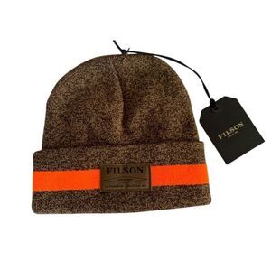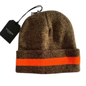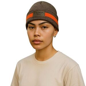• Brand New Filson Watch Cap Beanie – Brown with bold orange stripe, perfect for cozy streetwear vibes.