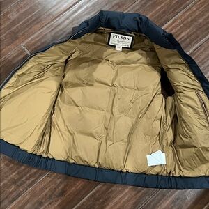 Quilted vest by Filson in dark blue with tan lining. Ideal for outdoor adventures.