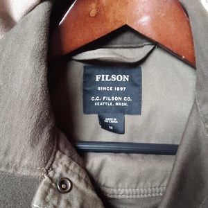 Women's size medium Filson jacket. I'm unsure of the style name or material, bc I removed the care tag when I bought it tep years ago (it was visible when worn open). Feels like a heavy moleskine. Soft but heavy and durable. In great used condition.