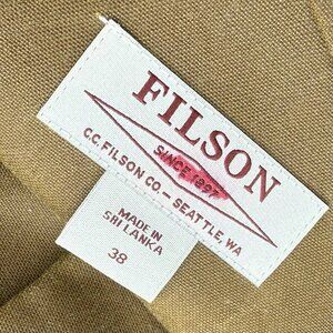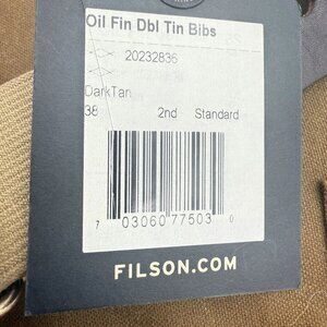 Men's Size 38 x 36 Filson Oil Finished Double Tin Cloth Hemmed Overalls Bib Made Dark Tan -New with tag. Marked as Factory2 by Filson. Some visual imperfections that do not affect the functionality/durability.